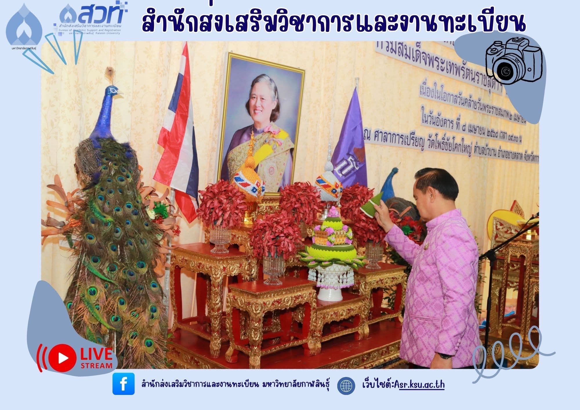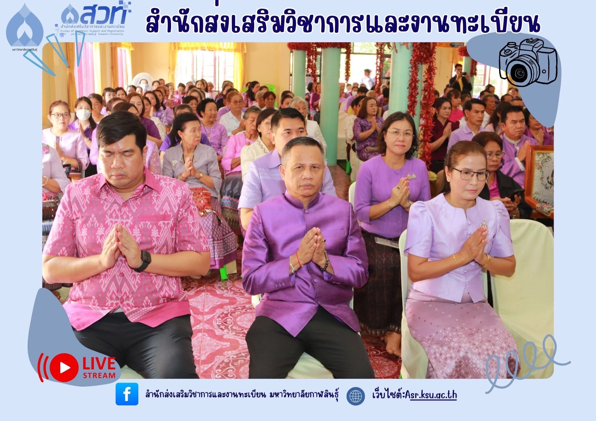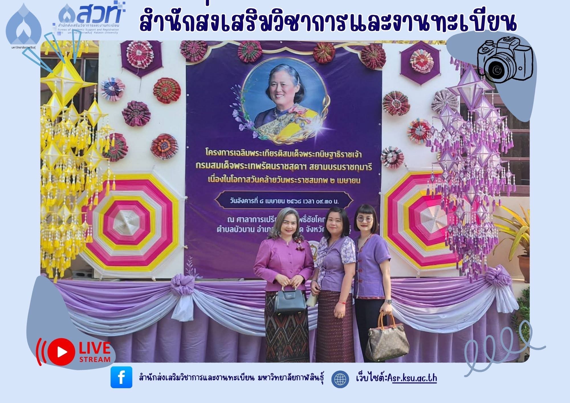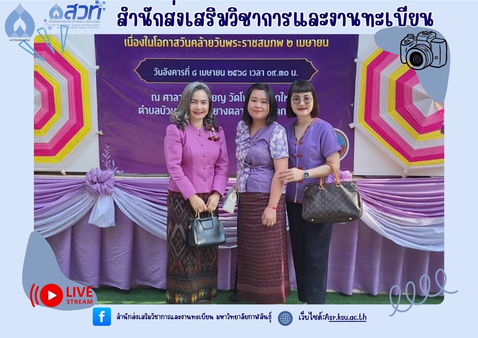 วันอังคารที่ 8 เมษายน 2568 นางถนอมรัตน์ มหาชัย หัวหน้าสำนักงานสำนักส่งเสริมวิชาการและงานทะเบียน พร้อมด้วยตัวแทนบุคลากรสำนักส่งเสริมวิชาการและงานทะเบียน เป็นตัวแทนของมหาวิทยาลัยกาฬสินธุ์ เข้าร่วมพิธีเทศน์มหาชาติ พระเวสสันดรชาดก เฉลิมพระเกียรติสมเด็จพระกนิษฐาธิราชเจ้ากรมสมเด็จพระเทพรัตนราชสุดาฯ สยามบรมราชกุมารี เนื่องในโอกาสวันคล้ายวันพระราชสมภพ 2 เมษายน ณ ศาลาการเปรียญ วัดโพธิ์ชัยโคกใหญ่ ตำบลบัวบาน อำเภอยางตลาด จังหวัดกาฬสินธุ์