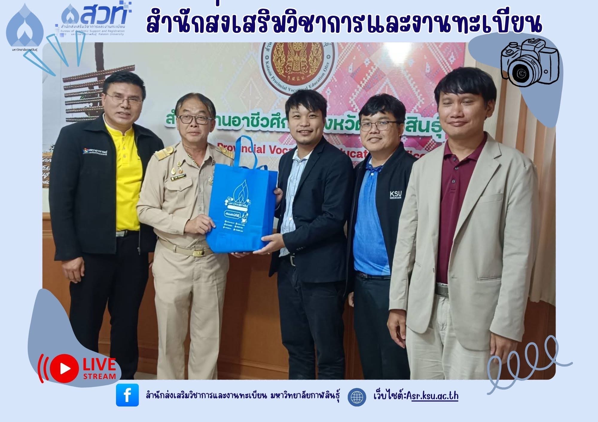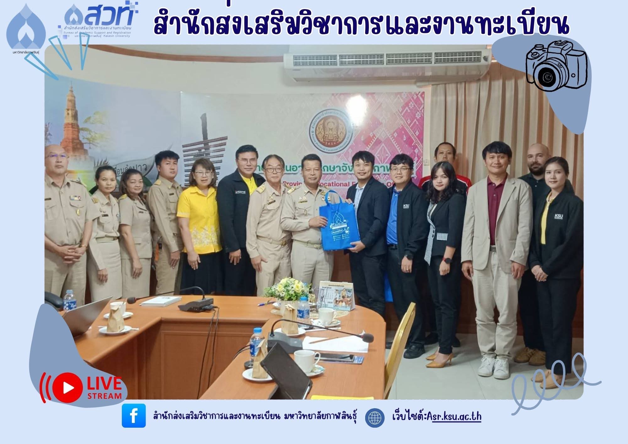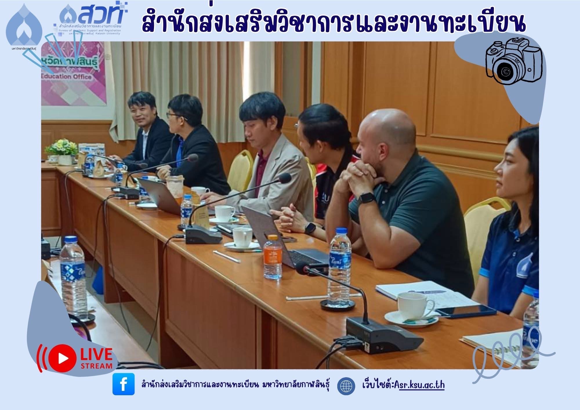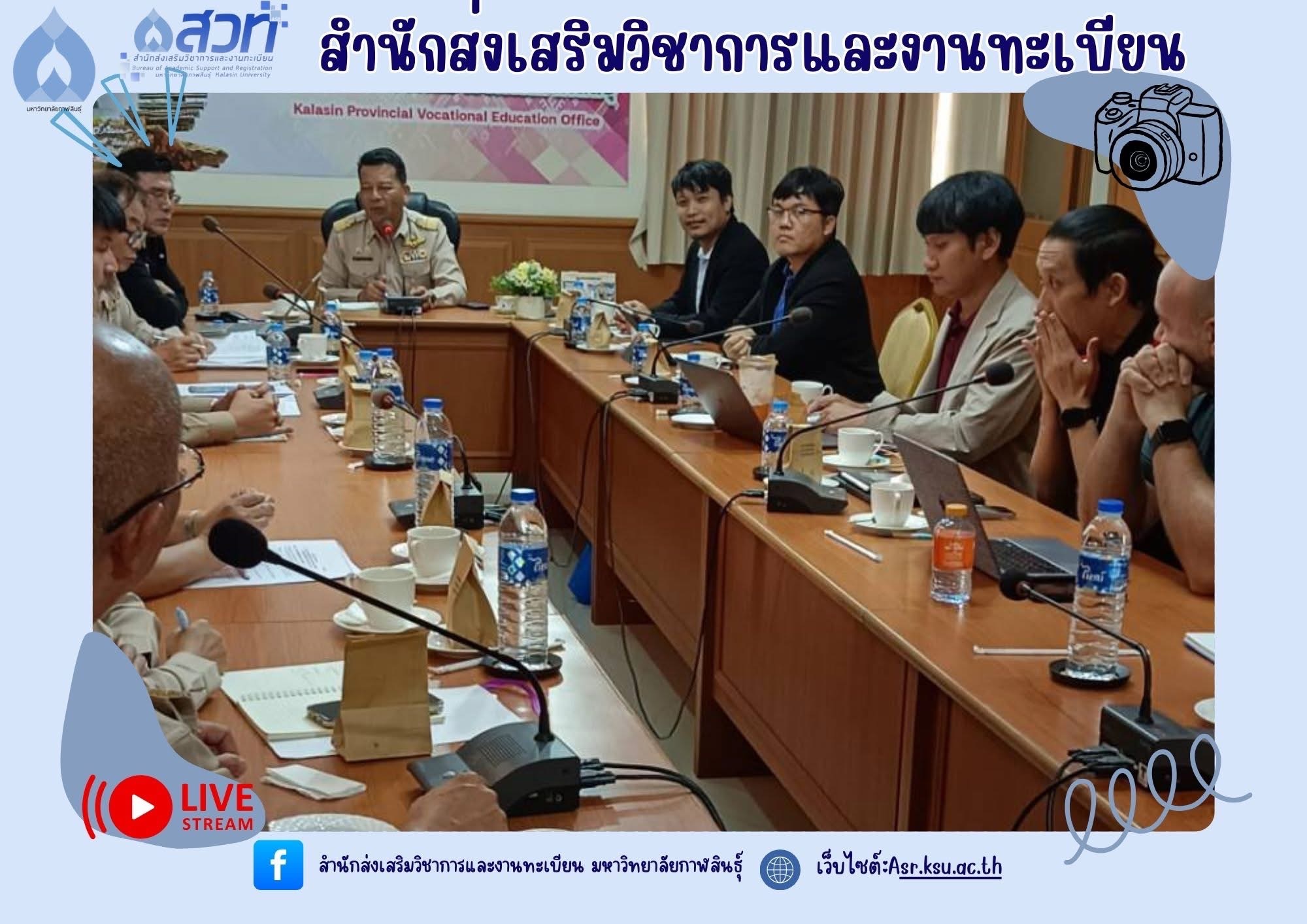 ได้รับมอบหมายจากอธิการบดีมหาวิทยาลัยกาฬสินธุ์ ให้เข้าร่วมประชุม กับผู้บริหารและคณาจารย์วิทยาลัยเทคนิคกาฬสินธุ์ เพื่อทำความร่วมมือในการพัฒนาด้านหลักสูตรการจัดการศึกษา Credit bank การส่งเสริมด้านภาษาอังกฤษ ภาษาจีน การวิจัยสำหรับครูเพื่อขี้นสู่วิทยฐานะ และการส่งเสริมด้าน AI และการใช้ฐานข้อมูลความรู้ร่วมกัน ณ ห้องประชุมวิทยาลัยเทคนิคกาฬสินธุ์